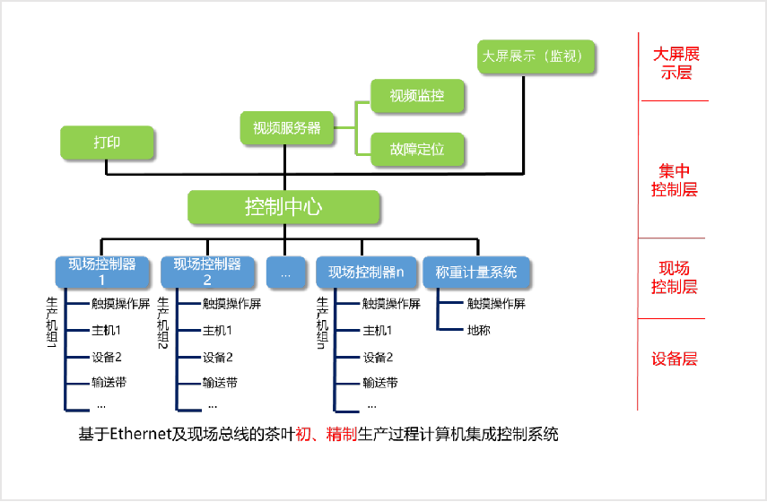 控制系統(tǒng)采用網(wǎng)絡(luò)技術(shù)及現(xiàn)場(chǎng)總線技術(shù),分為大屏展示(監(jiān)視)層、集中控制層、現(xiàn)場(chǎng)控制層和設(shè)備層共四級(jí)。系統(tǒng)通過(guò)網(wǎng)絡(luò),將現(xiàn)場(chǎng)控制單元進(jìn)行互聯(lián),將所有數(shù)據(jù)集中到總控計(jì)算機(jī)上,從而形成對(duì)整條生產(chǎn)線的控制以及生產(chǎn)參數(shù)與報(bào)表的匯總,并把相關(guān)的展示信息和畫(huà)面監(jiān)控信息投送大屏展示層,具備傳輸信號(hào)容量大、實(shí)時(shí)性強(qiáng)的特點(diǎn)。