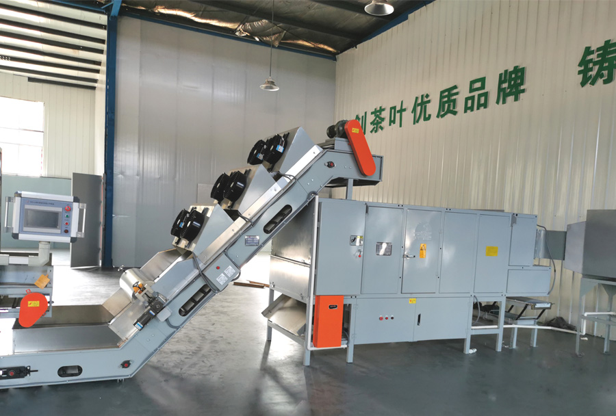 作業(yè)原理:機組采用搭接式結(jié)構(gòu),上料裝置與烘干箱體獨立,在防止漏茶的同時也減輕烘干機負(fù)載;采用臺灣輕型鏈條及雙滾輪、雙卷邊翻板,減少漏茶、夾茶 且降低運行噪音;等寬輸送使上料厚度更均勻;烘干箱體采用矩形管設(shè)計及石棉保溫處理,保證了烘箱四周的烘干溫度。